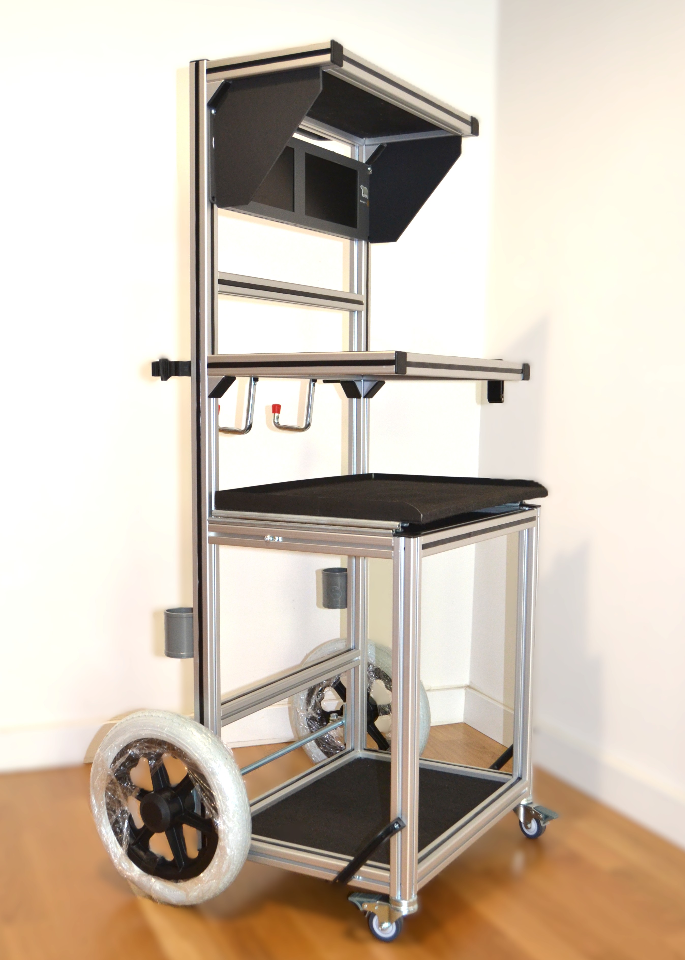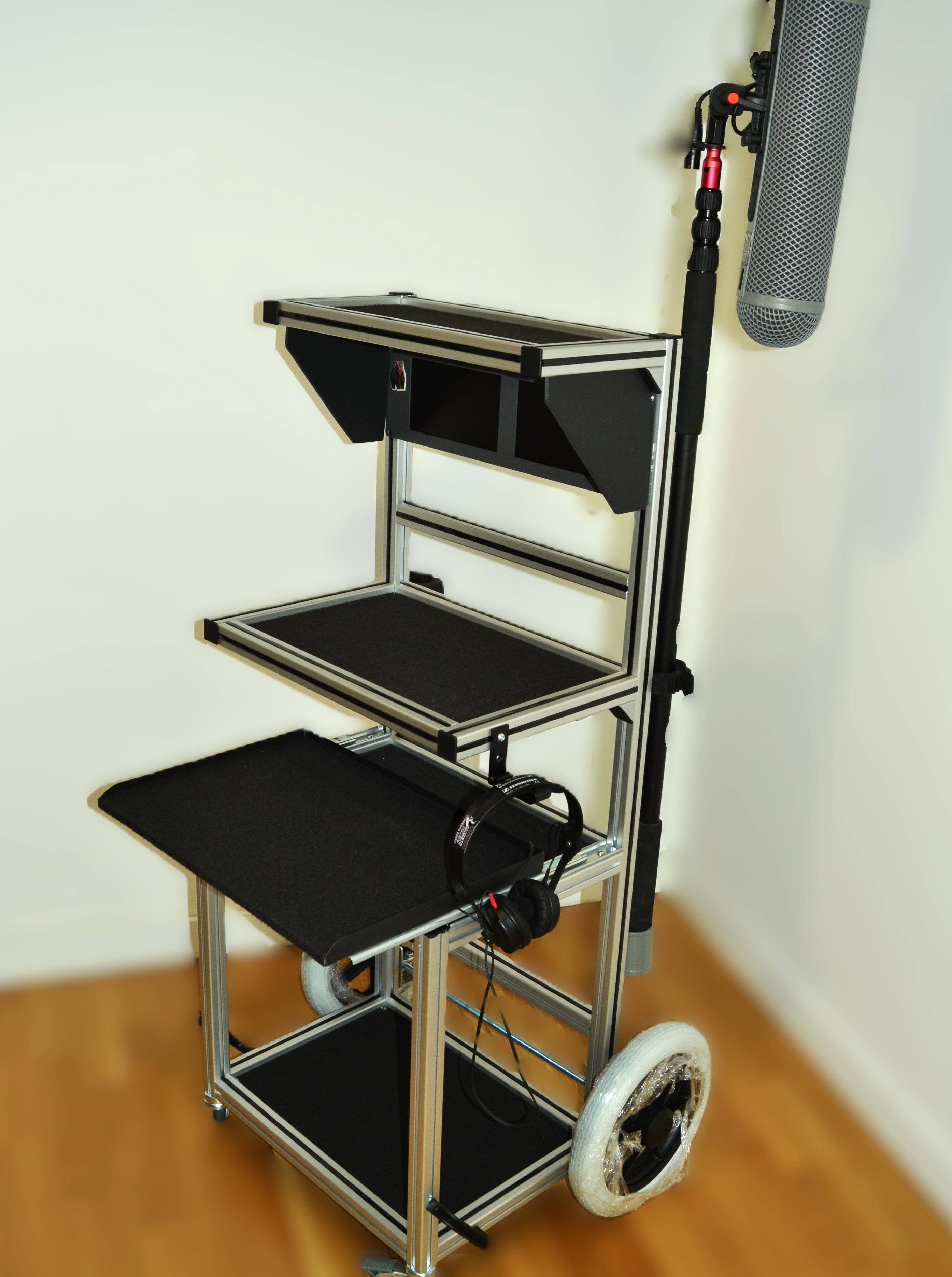Carro para técnico de sonido fabricado con perfiles de aluminio modular de 30 x 30 mm con ancho tamaño rack de 46cm. Dispone de 4 bandejas con superficie de moqueta negra, una superior de 43x25cm, tres de 43x40cm, una de ellas deslizante para mixer. Posee dos soportes para pértigas o antena, dos ganchos para cables, un soporte para auriculares y cuatro manetas para su transporte, ruedas de foam antipinchazos de 30cm de diámetro y dos pequeñas delanteras de 8cm giratorias con freno.