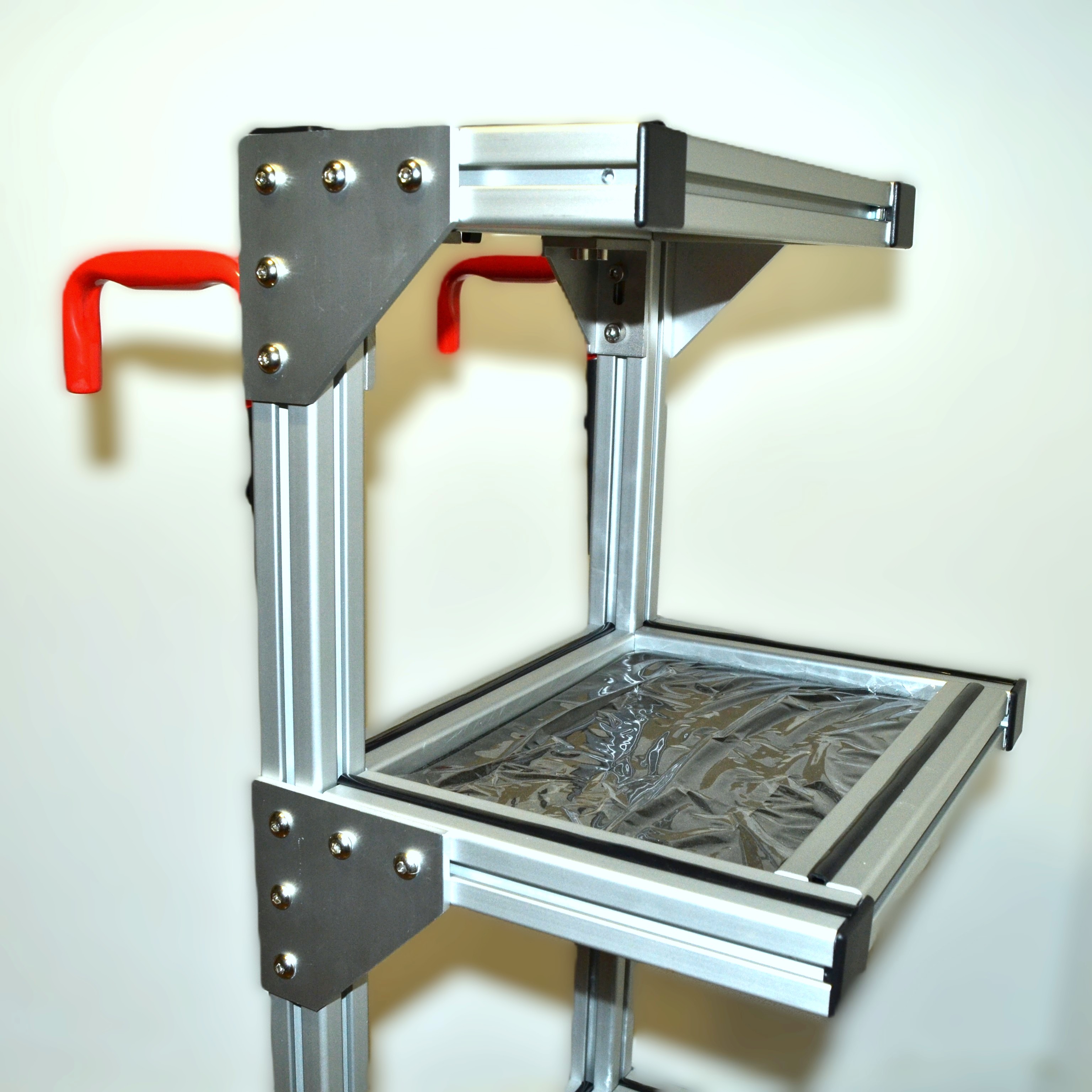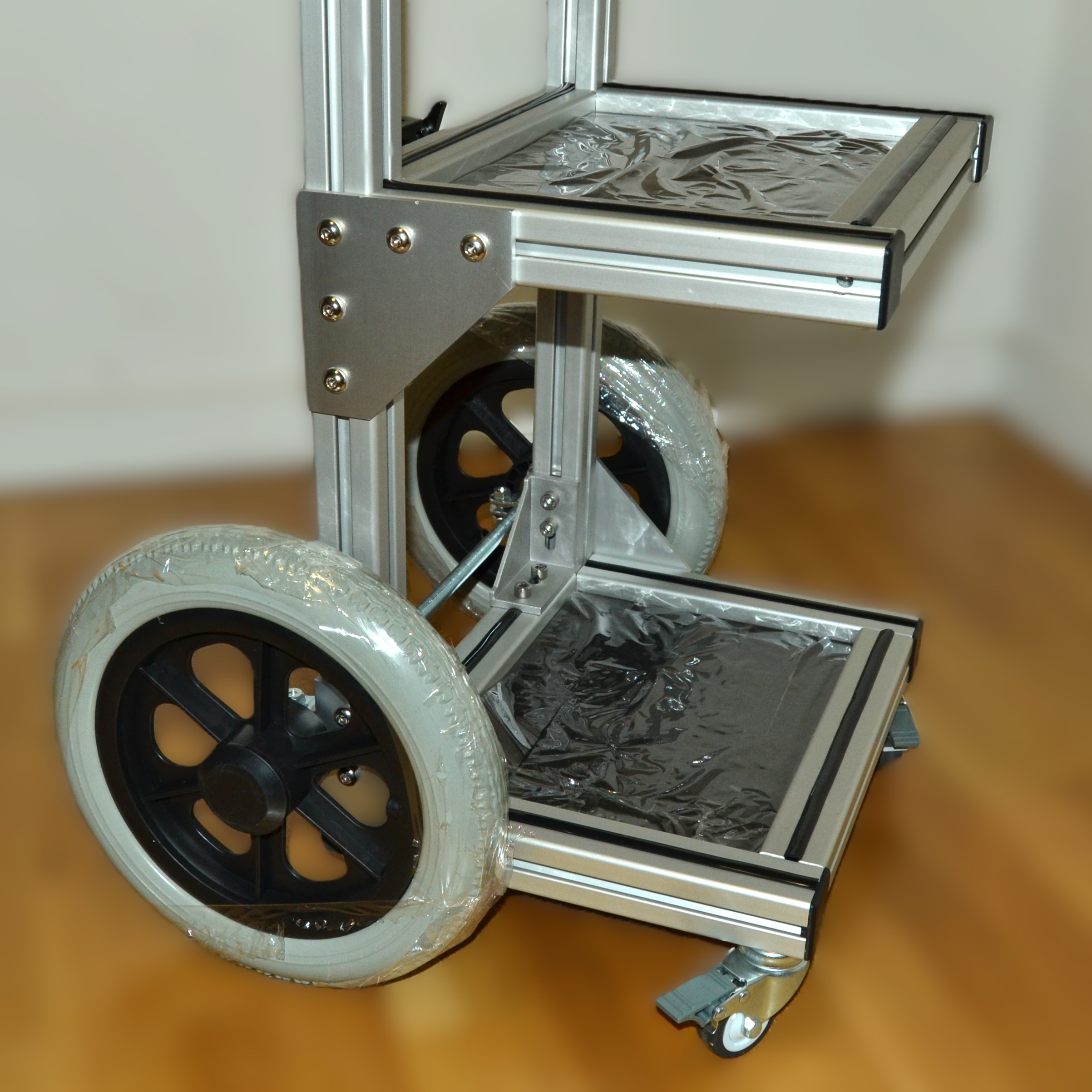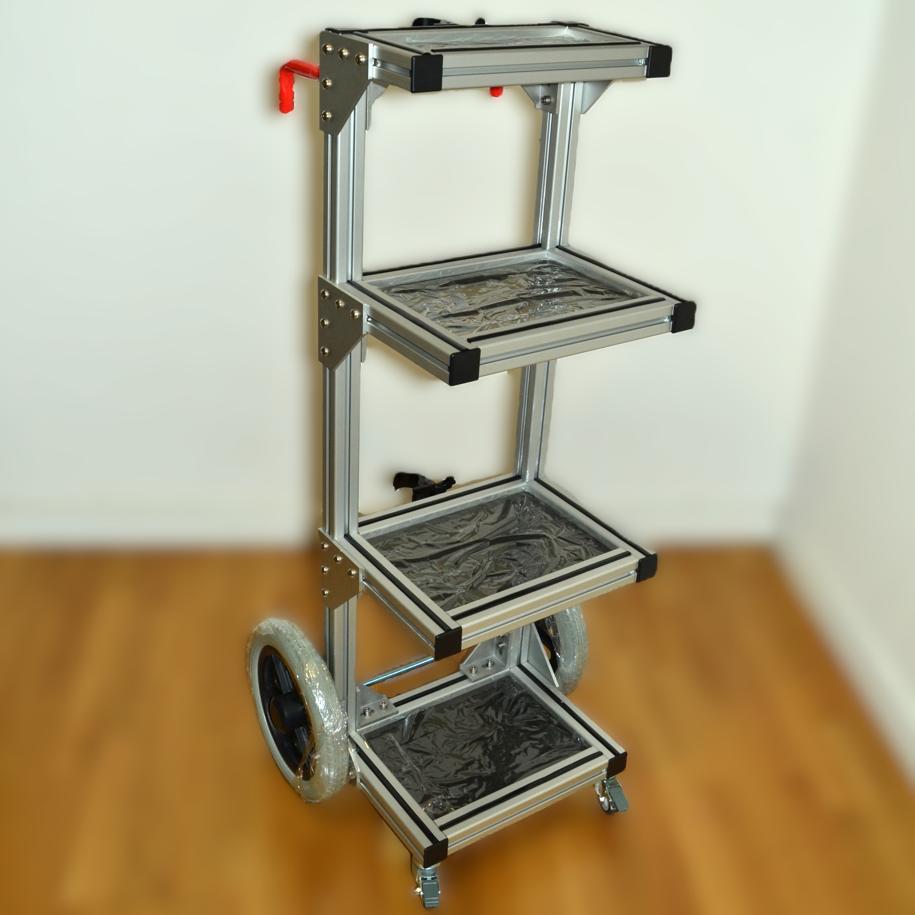 Carro para técnico de sonido u operador de luces, fabricado con perfiles de aluminio modular de 40 x 40 mm con ancho 38cm (50cm con ruedas). Dispone de 4 bandejas con superficie de moqueta negra, una superior de 38x20cm, tres de 38x20cm dos de ellas deslizables en altura. Posee un soporte para pértiga o barra para antena, ruedas de foam antipinchazos de 30cm de diámetro y dos pequeñas delanteras de 8cm giratorias con freno. Reforzado en todas las esquinas con escuadras de aluminio para una robustez extrema. Altura 1,20mt aprox.