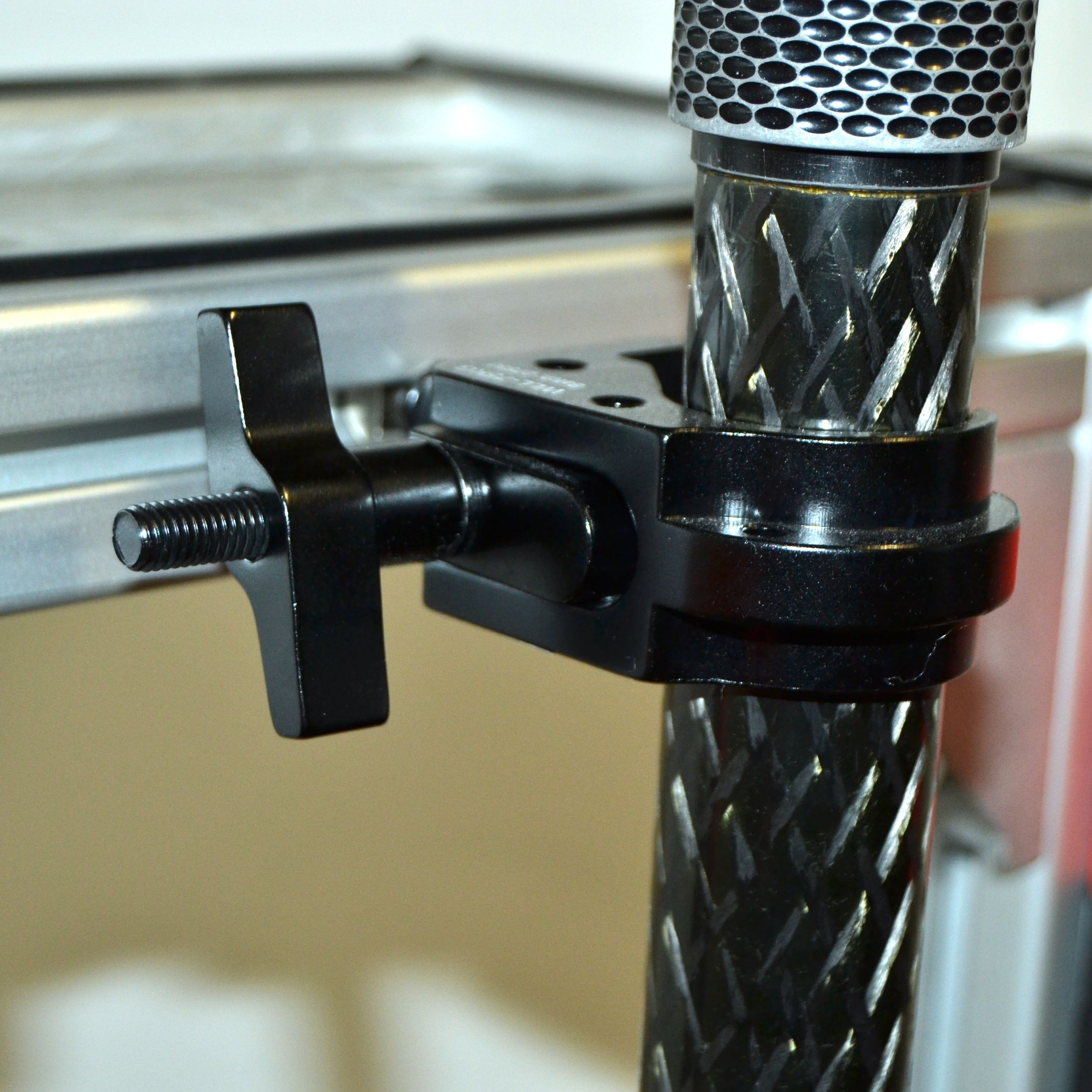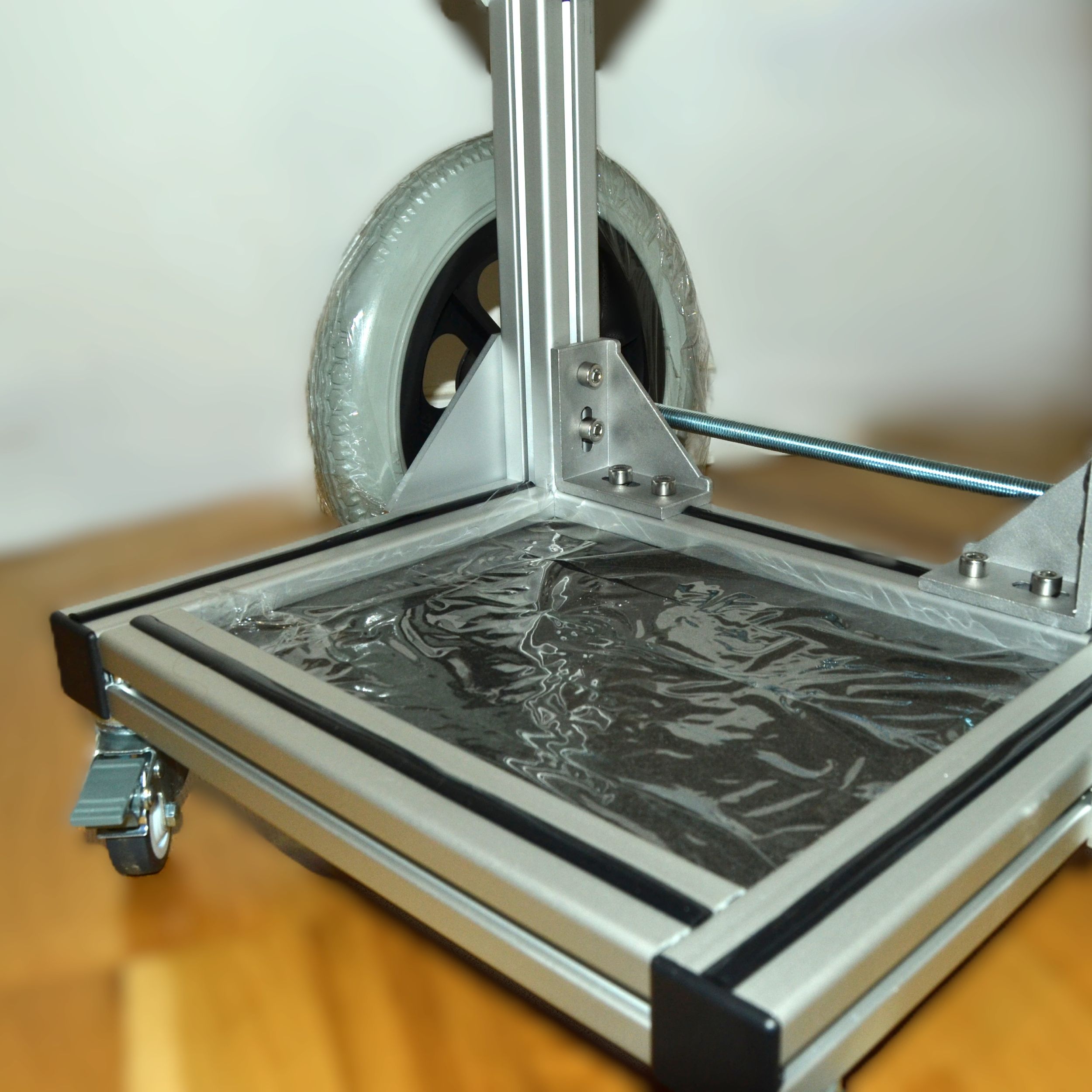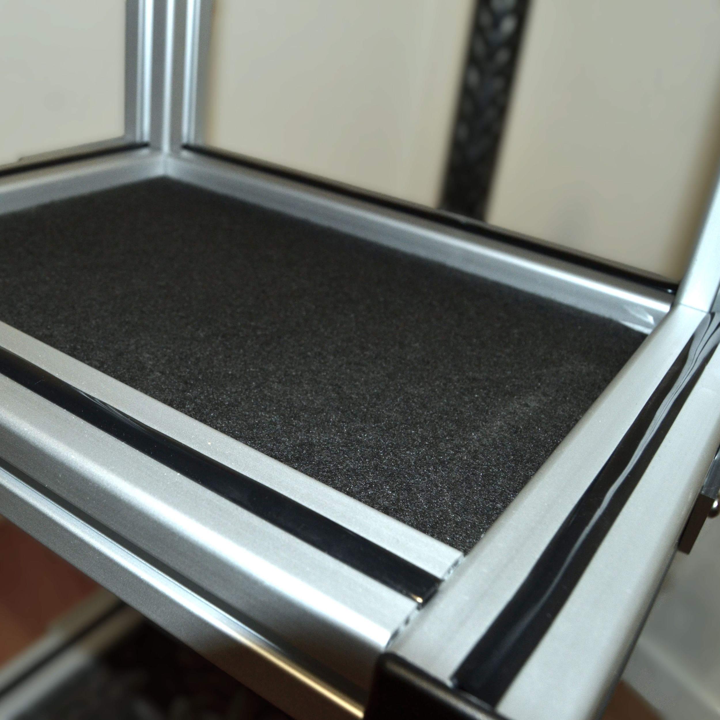 Carro para técnico de sonido u operador de luces, fabricado con perfiles de aluminio modular de 40 x 40 mm con ancho 38cm (50cm con ruedas). Dispone de 4 bandejas con superficie de moqueta negra, una superior de 38x20cm, tres de 38x20cm dos de ellas deslizables en altura. Posee un soporte para pértiga o barra para antena, ruedas de foam antipinchazos de 30cm de diámetro y dos pequeñas delanteras de 8cm giratorias con freno. Reforzado en todas las esquinas con escuadras de aluminio para una robustez extrema. Altura 1,20mt aprox.