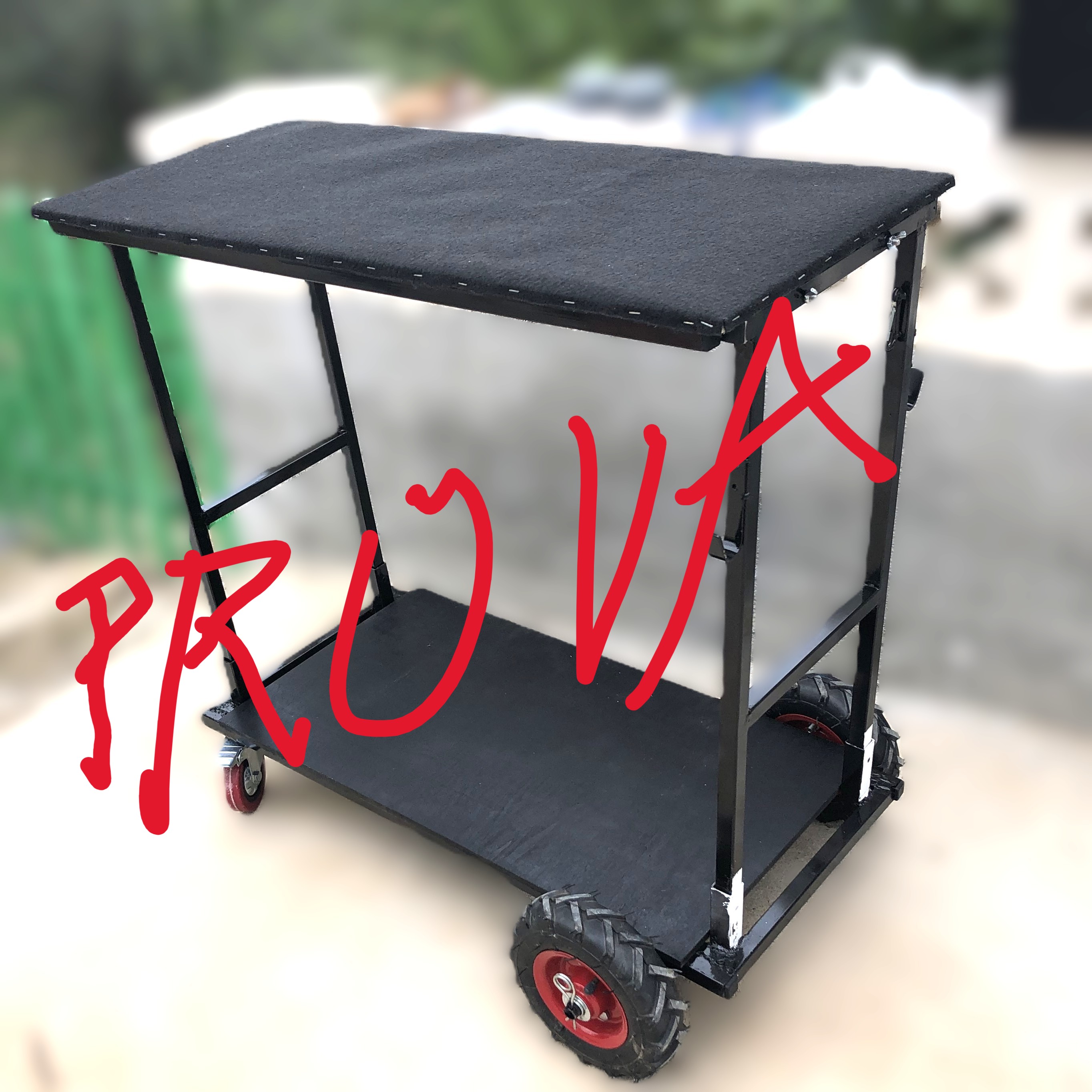 Carro de acompañamiento para carga y trabajo. Fabricado en tubo de hierro de 20x20mm, soldado y desmontable. cuatro ruedas neumáticas, con superficie para trabajar en set. Medidas de 100cm x 45cm.